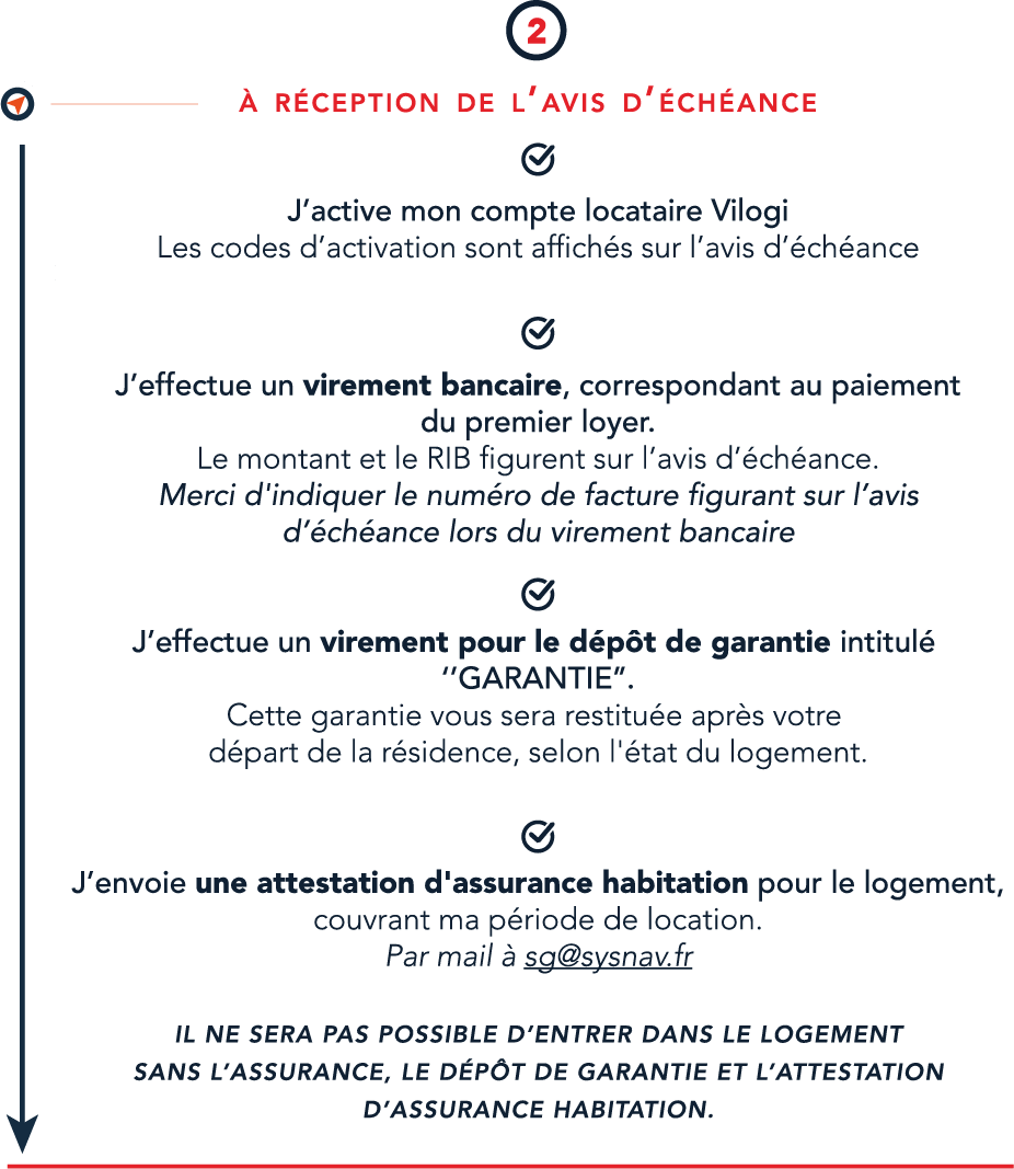 Vous recevrez environ 15 jours avant votre location votre premier avis d’échéance. Vous y trouverez des codes d’accès à la plateforme appelée Vilogi qui vous permet de retrouver tous les éléments en rapport avec votre contrat (bail, état des lieux, avis d’échéance, RIB Sysnav…etc.).